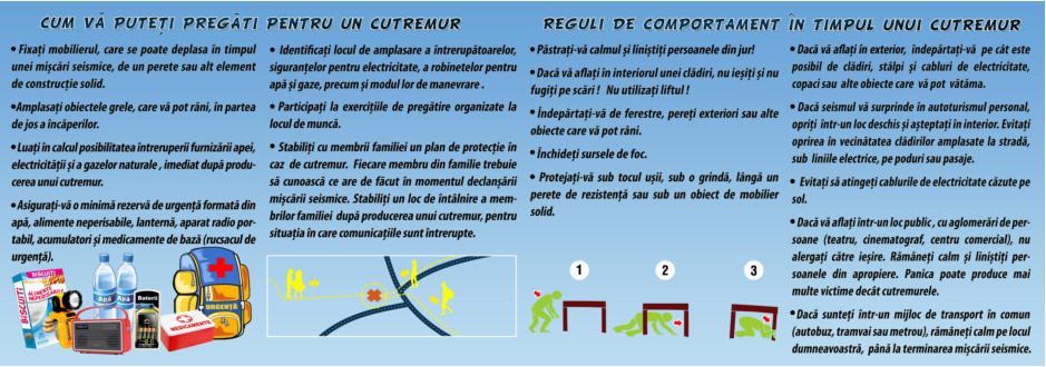 comportamentul adecvat în situația declanșării unui cutremur de magnitudine ridicată. Sunt abordate mai multe situații: în locuință, pe